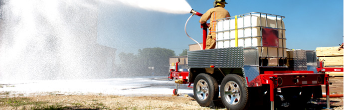 Self-contained CHEMGUARD single-, dual- and triple-tote foam trailers are designed to provide fire suppression and vapor control for demanding applications. The tote trailers may be customized with various options for inlet connections, foam concentrate pumps and piping, proportioning equipment, and self-educting nozzles.